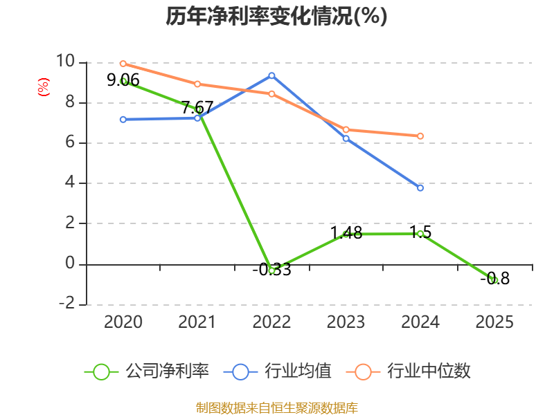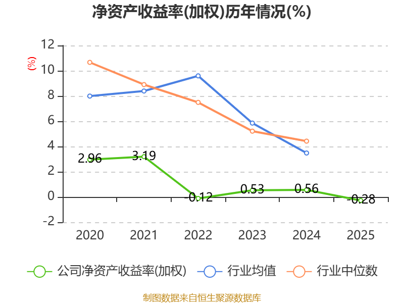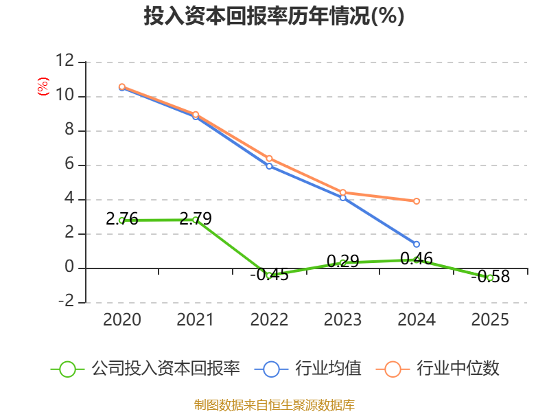 数据显示,2025年公司加权平均净资产收益率为-0.28%,较上年同期下降0.84个百分点。公司2025年投入资本回报率为-0.58%,较上年同期下降1.04个百分点。