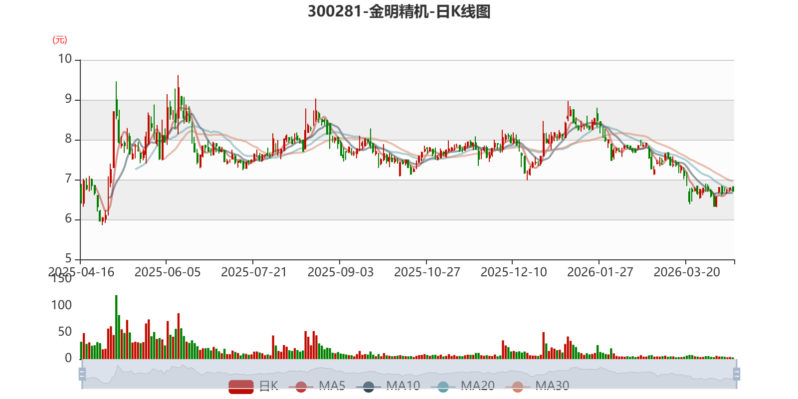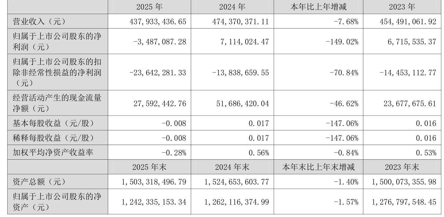 中证智能财讯金明精机(300281)4月16日披露2025年年度报告。2025年,公司实现营业总收入4.38亿元,同比下降7.68%;归母净利润亏损348.71万元,上年同期盈利711.4万元;扣非净利润亏损2364.23万元,上年同期亏损1383.87万元;经营活动产生的现金流量净额为2759.24万元,同比下降46.62%;报告期内,金明精机基本每股收益为-0.008元,加权平均净资产收益率为-0.28%。公司2025年度分配预案为:拟向全体股东每10股派现0.2元(含税)。