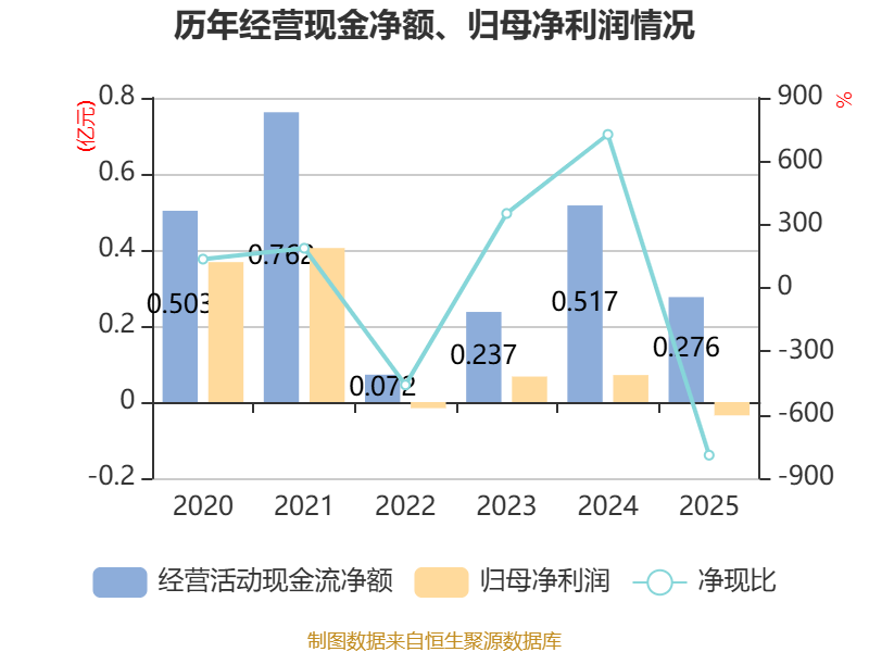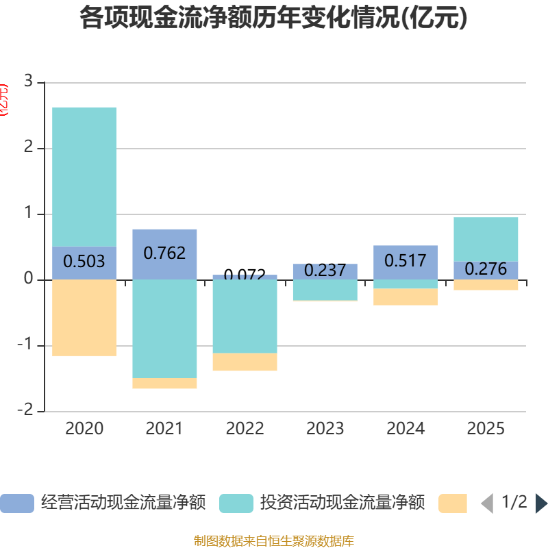 截至2025年,公司经营活动现金流净额为2759.24万元,同比下降46.62%;筹资活动现金流净额-1616.52万元,同比增加905.08万元;投资活动现金流净额6702.85万元,上年同期为-1401.35万元。
