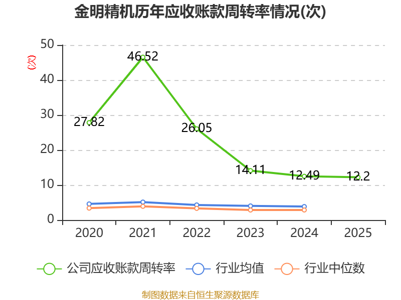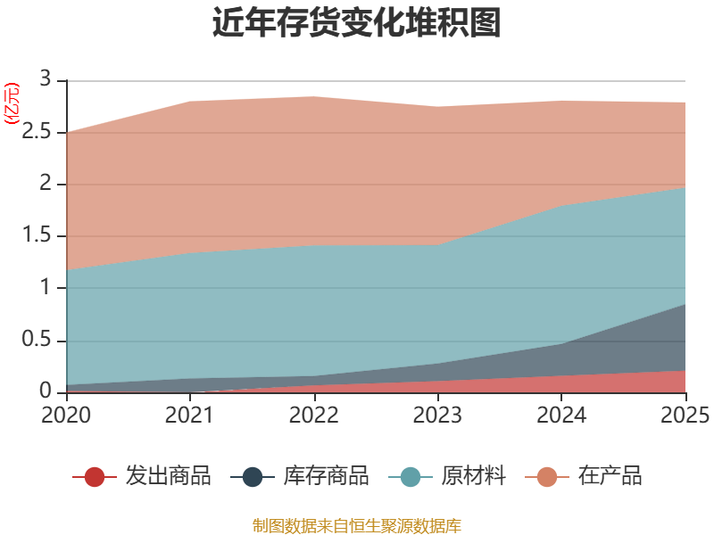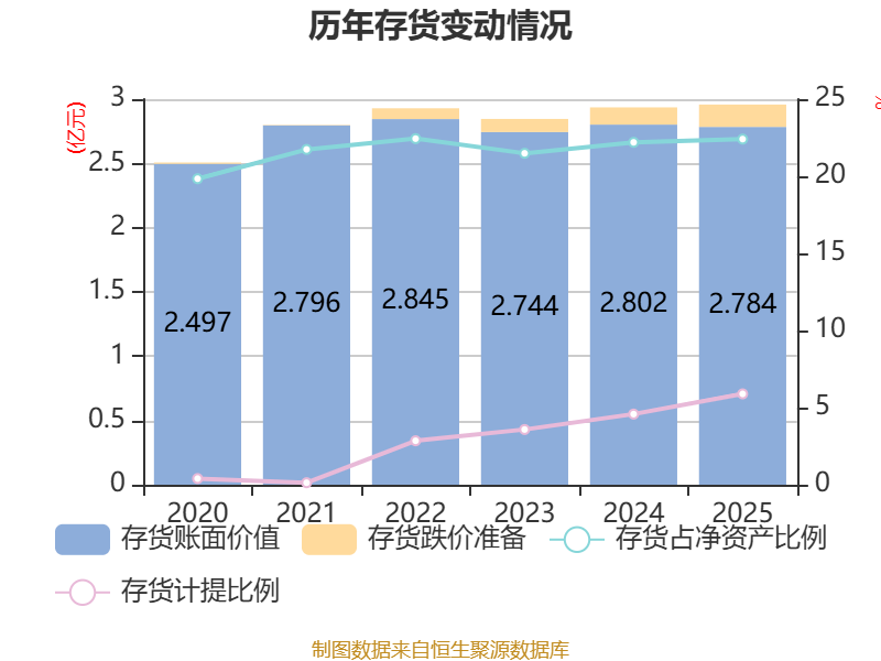 从存货变动来看,截至2025年末,公司存货账面价值为2.78亿元,占净资产的22.41%,较上年末减少180.5万元。其中,存货跌价准备为1743.61万元,计提比例为5.89%。