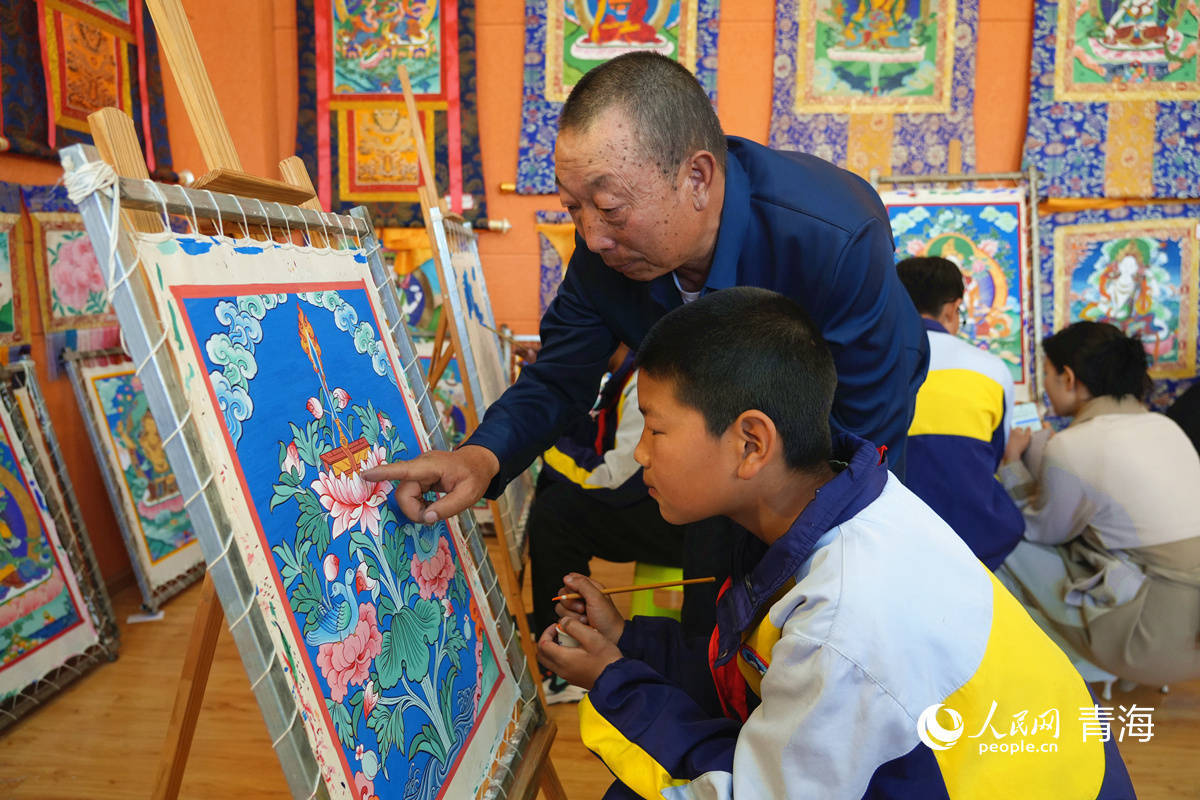 同仁市热贡艺术小学六年级学生画唐卡。人民网记者 杨启红摄