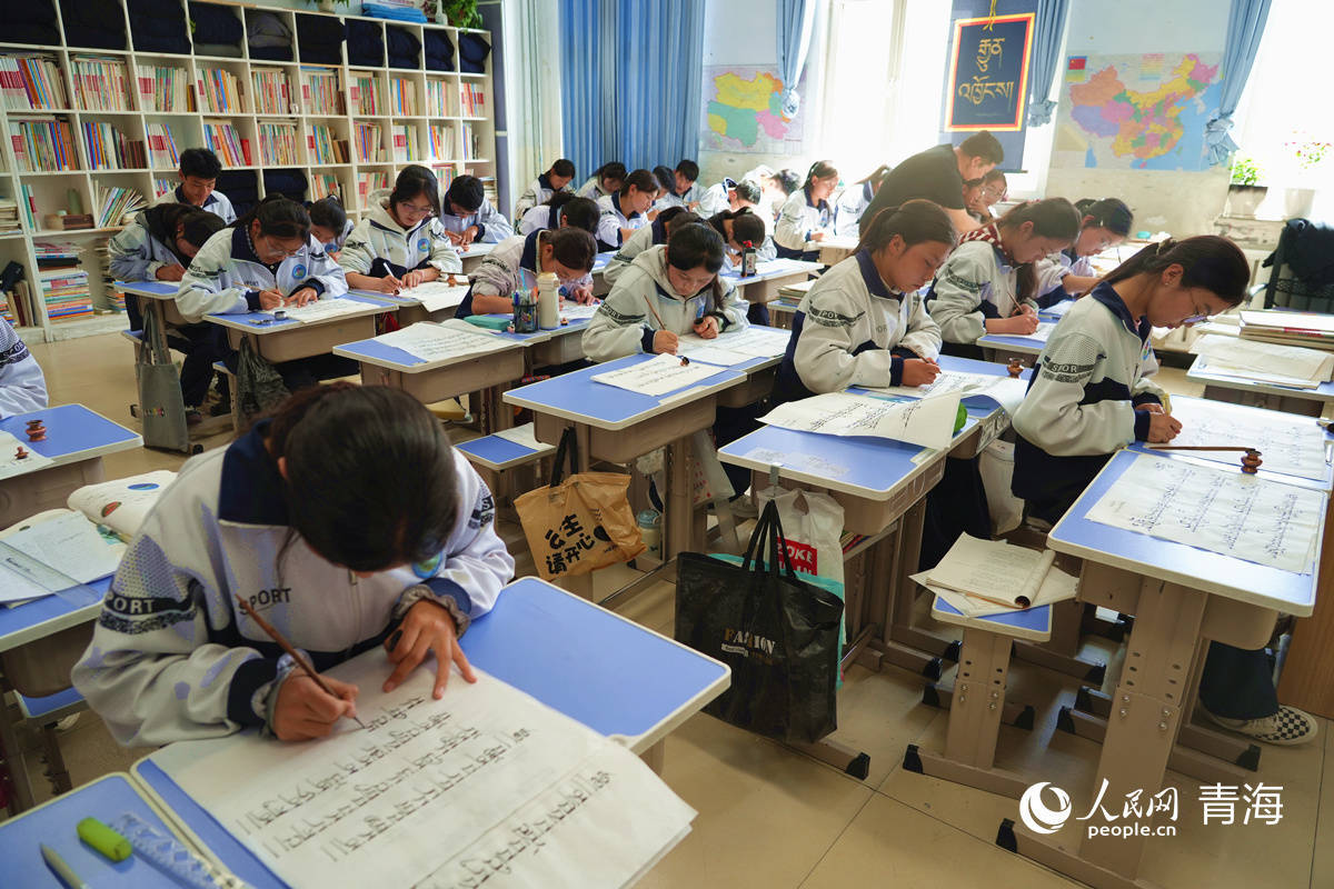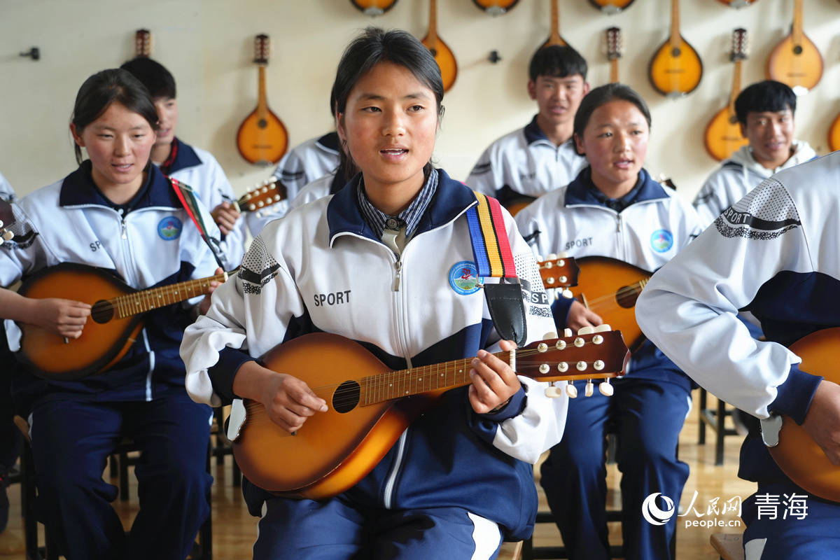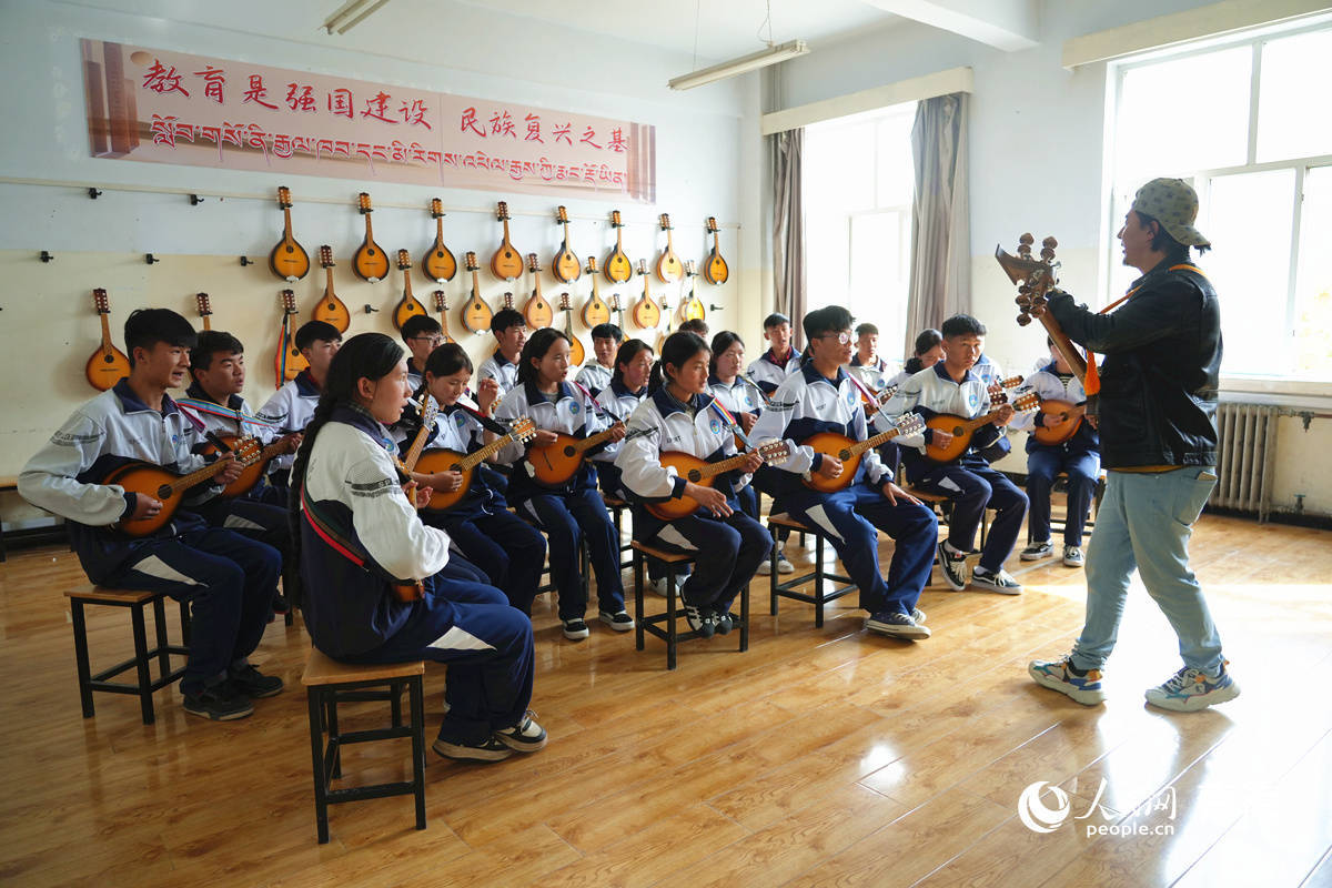 同仁市第一民族中学学生学习弹唱。人民网记者 杨启红摄